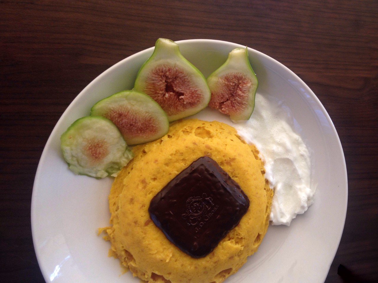 Sugestão: Podes acompanhar com um alimento leve, rico em proteínas, como o quark, grego ligeiro - ou se estás, mesmo, mesmo com vontade de doces, um quadradinho de chocolate +70% cacau (põe-no enquanto o mugcake ainda está quente, vai derreter o chocolate e formar um topping delicioso!)